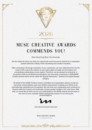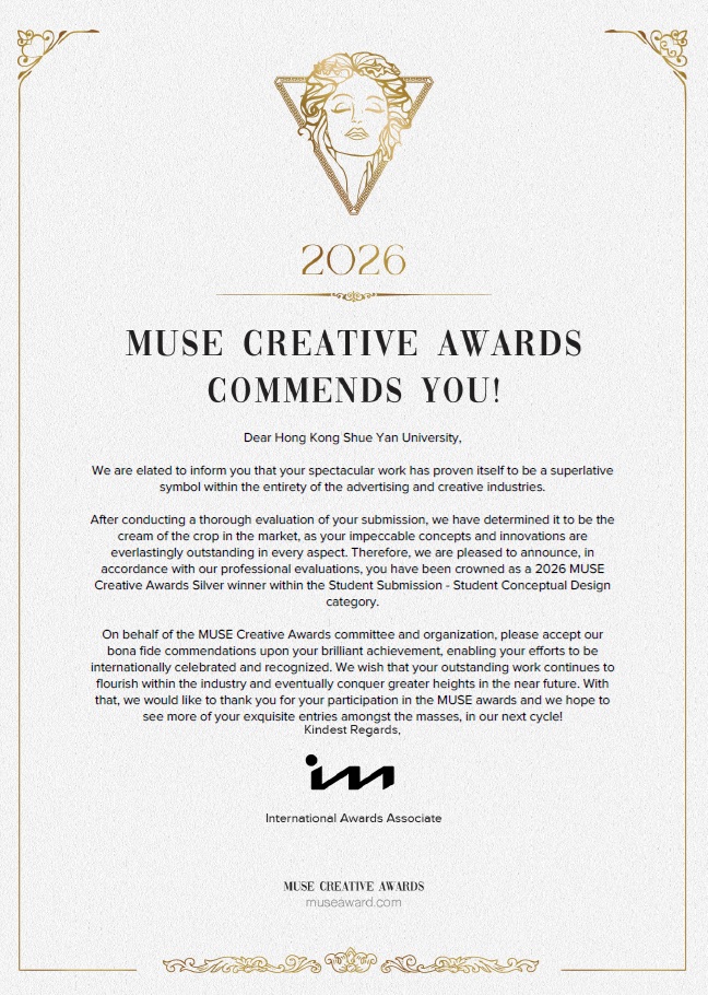 Congratulations to a team of three Year-3 students of the BA (Hons) in Media Design and Immersive Technology, Chen Gongyue, Chen Tingyi and Li Zaidan, as the Silver Winner of the 2026 MUSE Creative Awards within the Student Submission - Student Conceptual Design category! The team is coached by Dr. Dina Ding, Assistant Professor at the Department of Journalism and Communication, HKSYU.